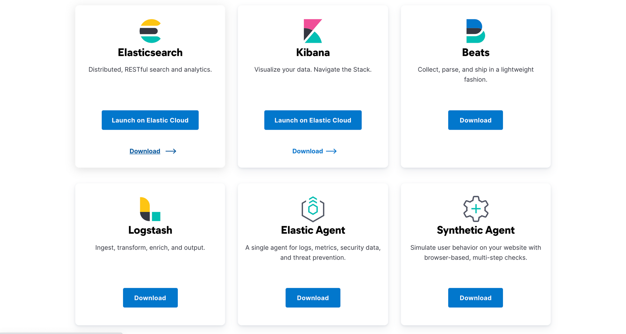 Go to the downloads page and install Elasticsearch, Kibana, Logstash, and Filebeat (Beats section) in the same order. There are instructions to install them using Zip files; Package Managers like apt, homebrew, yum, etc; or Docker. (For Elastic Cloud, you don't have to install Elasticsearch and Kibana).