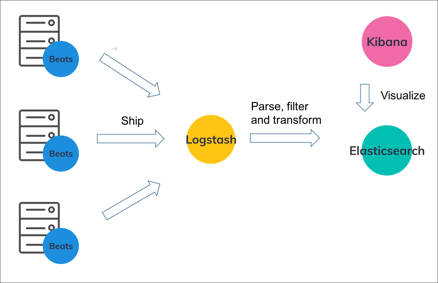 You can see that we are using Filebeat (or any other Beats) on the main server where our application is adding logs to the log file(s). This Filebeat is sending logs to the Logstash server that is being used to process/transform the logs and sends them to Elasticsearch.