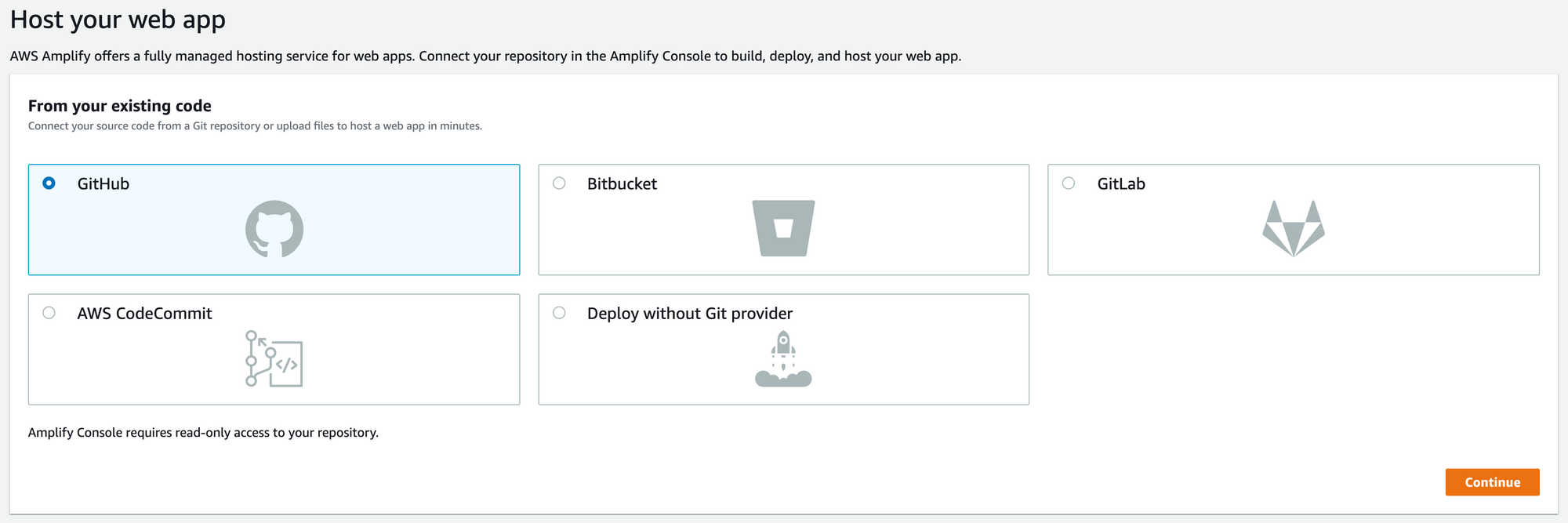 While creating an app, we'll need to give Amplify access to your Gitlab, Github, Bitbucket, etc., account. After that, we can see the list of all the repositories available to us in that account.