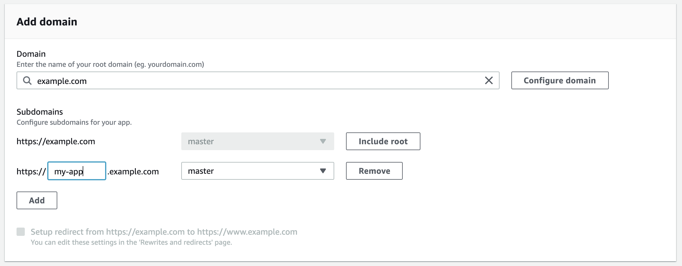 example.com(and notmy-app.example.com) to configure the domain. - You may see the list of subdomains now. (