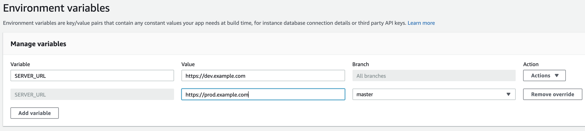 aws amplify create-branch --app-id d1kkiwslwnw735 --branch-name devHandling environment variables